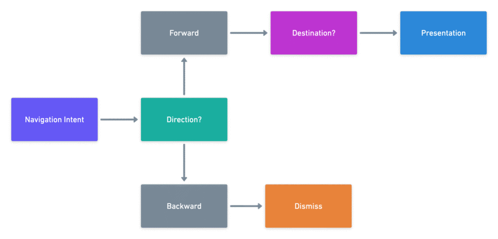 When there is an intent to navigate, we determine which direction we would like to go. Are we returning to a previous experience (navigating backward)? Or are we moving onto the next step of the flow (navigating forward)? Based on the direction, the intent will either result in a new destination being presented or some form of a dismissal